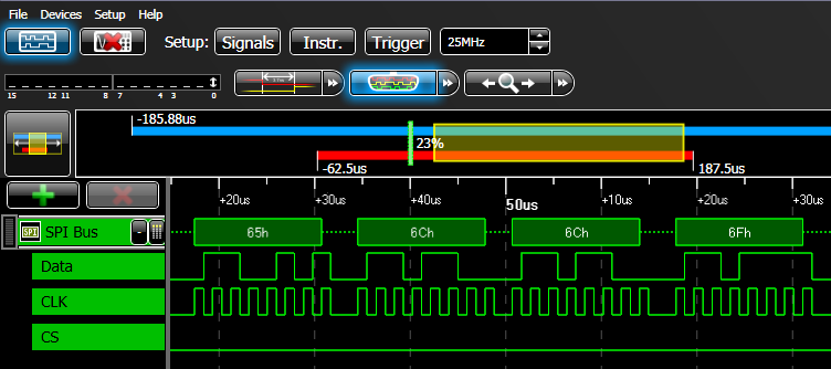 La comunicazione fra il software di LogicStudio ed il WaveJet consente anche la configurazione del trigger ed il trasferimento dei dati consentendo visualizzare in modalità integrata a coordinata tutti i dati digitali, seriali ed analogici.