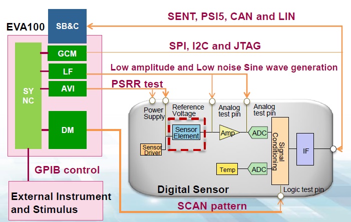 La disponibilità di schede di generazione di segnali a basso rumore e delle corrispondenti schede di acquisizione permette di verificare le prestazioni anche dei componenti più flessibili, mentre l'integrazione dei comandi per la comunicazioni digitali all'interno del linguaggio di programmazione grafico sviluppato da Advantest per il controllo e la programmazione della piattaforma EVA 100 rende molto rapida e intuitiva la scrittura delle procedure di collaudo.