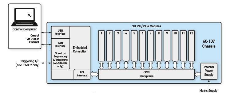 Lo chassis offre 12 slot ibridi PXI/PXIe in formato rack di altezza 2U e può essere controllato tramite USB o LXI (Ethernet), eliminando la necessità di un controller PXI dedicato o di un PC integrato.