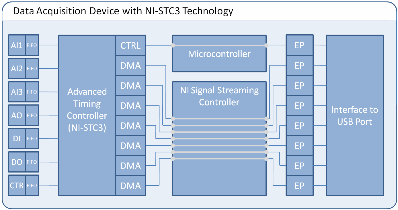I dispositivi USB della Serie X includono anche la tecnologia di comunicazione Signal Streaming brevettata da National Instruments, che utilizza il trasferimento basato su messaggi e l’intelligenza del dispositivo per fornire un trasferimento bidirezionale veloce di dati tramite il bus USB, che consente di eseguire contemporaneamente operazioni analogiche, digitali e di conteggio.