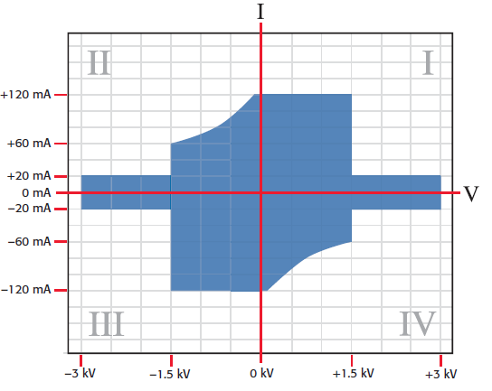 L'unità di alimentazione integrata in SourceMeter 2657A può erogare o assorbire fino a 180 W di potenza continua (±3,000 V a 20mA, ±1500V a 120 mA).