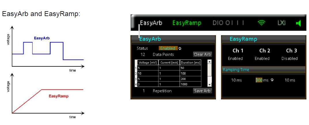 Inoltre, per simulare transitori di alimentazione o particolari sequenza di accensione, l'alimentatore dispone al suo interno di un vero e proprio generatore di forme d'onda arbitrarie, che consente di generare facilmente rampe o altri segnali di stimolo utili nelle procedure di collaudo e validazioni di dispositivi e sistemi elettronici.
