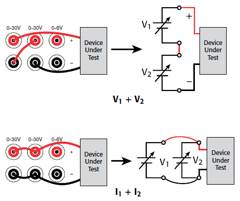 Per ottenere tensioni o correnti più elevate, i canali da 30 V possono essere collegati in serie per erogare fino a 60 V, mentre due o tre canali possono essere collegati in parallelo per erogare fino a 15 A con il modello 2230G-30-6.
