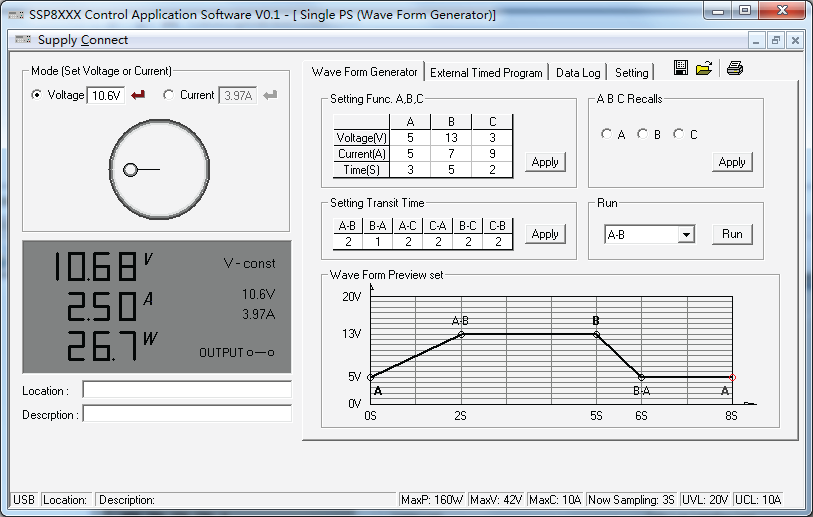 Le uscite possono essere pilotate in modalità a corrente costante oppure a tensione costante, così come possono essere fatte variare in base a sequenze di valori e forme d'onda programmabili.