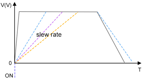 La velocità di variazione (slew rate) della tensione di uscita à programmabile pe prevenire assorbimenti transitori troppo elevatiGli alimentatori serie SPS6000X consentono di personalizzare le pendenze dei fronti di salita e discesa della tensione e della corrente.