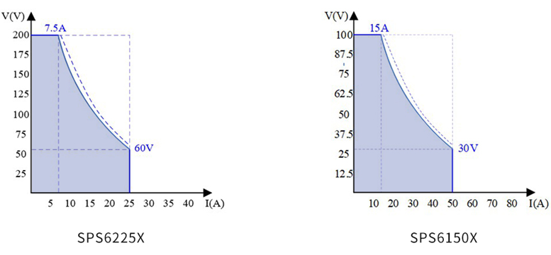 A differenza degli alimentatori tradizionali con un caratteristica di uscita I/V rettangolare fissa, gli alimentatori a commutazione della serie SPS6000X offrono una combinazione più ampia e flessibile dei limiti di tensione e corrente massima.