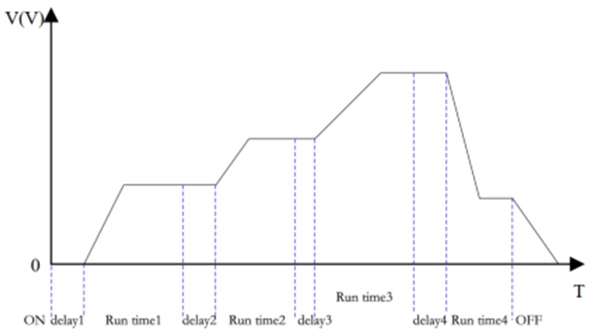 Sequenze di tensioni di uscita programmabiliGli alimentatori serie SPS6000X dispongono di una funzione elenco molto intuitiva, che consente agli utenti di programmare sequenze di test complesse definendo le impostazioni dei singoli passi, la durata e le pendenze delle tensioni di uscita.