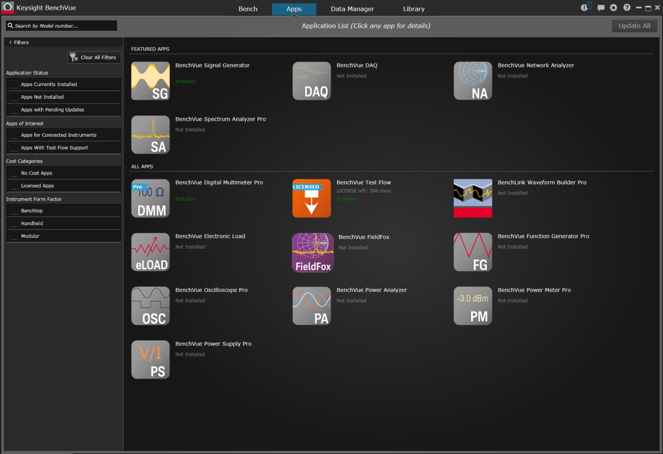 Con BenchVue 3.5 sono state introdotte da Keysight anche nuove app che supportano i generatori di segnali e i contatori universali, nonché la serie di analizzatori di spettro palmare FieldFox.