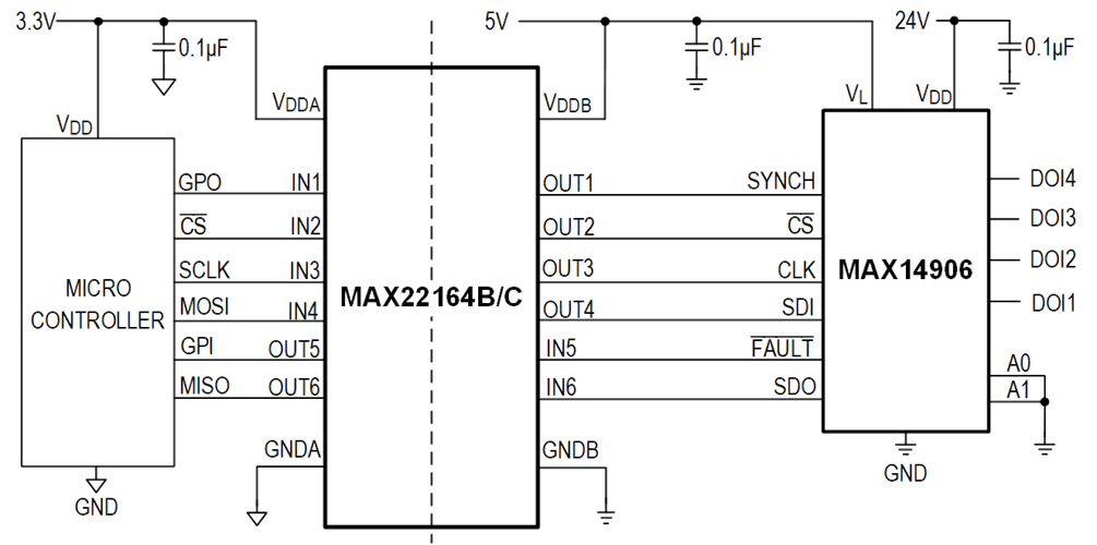 Per supportare la comunicazione digitale sicura tra due sottosistemi isolati, è molto comodo sfruttare dei circuiti integrati espressamente progettati a tale scopo, come ad esempio i dispositivi della famiglia MAX22163–MAX22166 di Analog Devices.