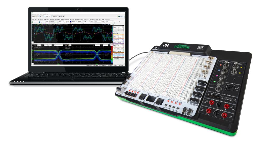 Dotato di un oscilloscopio con risoluzione a 14 bit, un generatore di forme d'onda, un analizzatore logico, un analizzatore di spettro, un multimetro digitale (DMM), un alimentatore a uscite multiple e un analizzatore di protocollo, NI Digilent Analog Discovery Studio Max combina diversi strumenti di cui gli studenti di ingegneria hanno bisogno per apprendere tutti i principi fondamentali dell'elettronica.