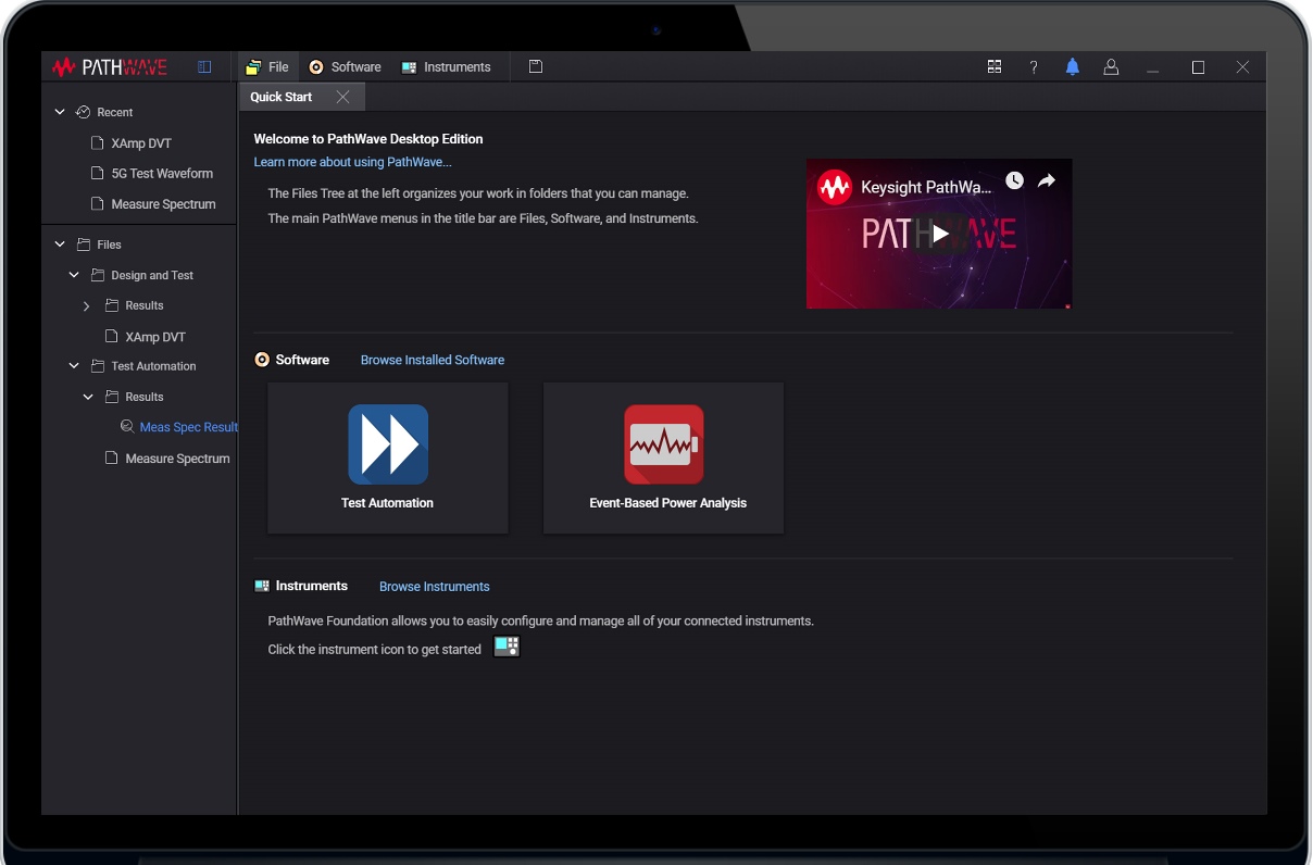 Al centro della suite software PathWave Test 2020 vi è PathWave Desktop Edition, un pacchetto che permette di accedere alla piattaforma per lanciare e gestire applicazioni che fanno parte dell'ecosistema di progettazione e collaudo di un dispositivo o sistema elettronica.