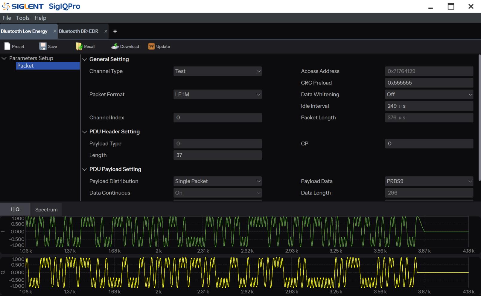 SigIQPro permette di generare segnali conformi a tutte le possibili varianti degli standard BluetoothL'aumento della velocità di trasmissione dati e i requisiti di larghezza di banda più elevati spingono a creare segnali più complessi per verificare le prestazioni dei dispositivi nei test reali. La creazione di forme d'onda di test sta diventando sempre più difficile e i progettisti devono dedicare sempre più tempo e fatica per generare con precisione i segnali richiesti dai test previsti dagli standard, che introducono nuove sfide significative per effettuare le prove e le misure necessarie in tutte le fasi del ciclo di sviluppo del prodotto tutti i livelli, dai componenti ai circuiti RF, digitali e di potenza.