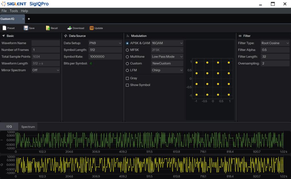 Grazie alla possibilità di definire segnali personalizzati per le componenti in fase (I) e in quadratura (Q), si possono verificare sistemi con qualunque tipologia di modulazione digitaleSigIQPro è un software flessibile per la generazione di segnali basato su PC che supporta un'ampia varietà di standard di connettività cellulare e wireless, facilitando la generazione di forme d'onda complesse previste dagli standard Bluetooth, IoT,e altri standard di comunicazione, come come forme d'onda OFDM e IQ personalizzate.