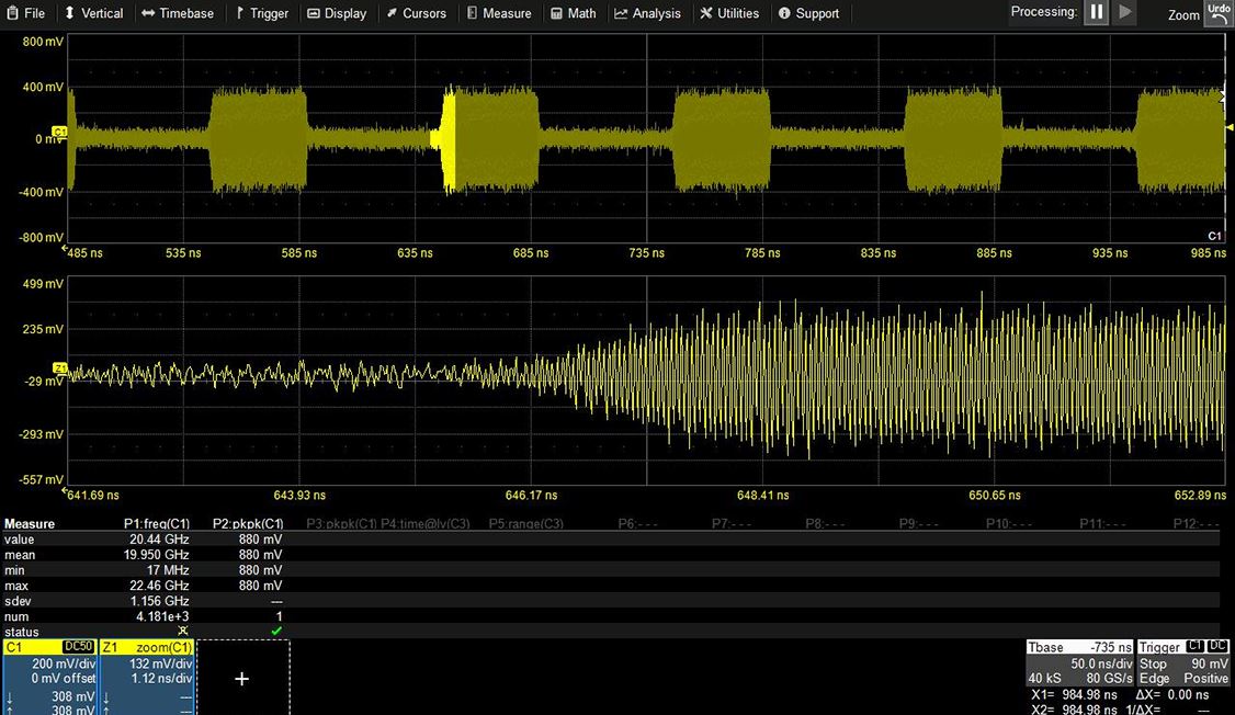 Il generatore di treni di impulsi ha una larghezza di impulso di 20 ns ~ 300 s e ben 2047 impulsi diversi. Il periodo di ripetizione degli impulsi può essere modificato da 1 a un massimo di 65.535, per ottenere un treno di impulsi molto lungo e personalizzabile da utilizzare per i test dei sistemi più complessi.