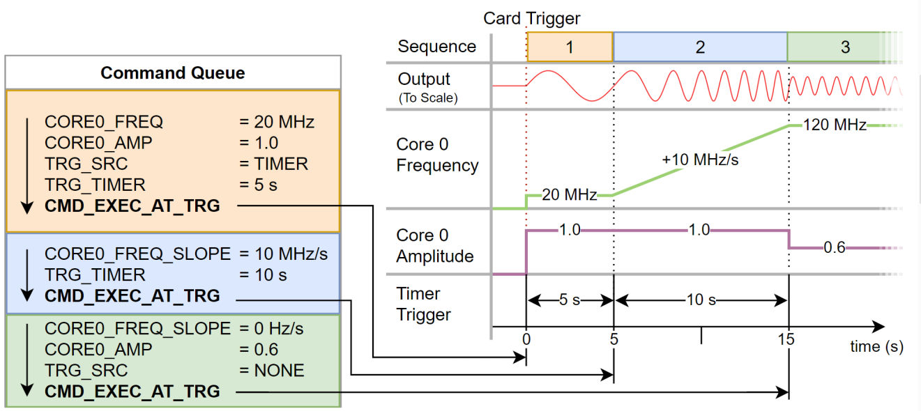 Comandi del generatore AWG in modalità DDS: definizione onda (blocco arancione), accelerazione frequenza (blocco blu) e riduzione ampiezza (blocco verde).Tutte le funzionalità chiave necessarie per la ricerca quantistica sono integrate. Con un solo comando, gli utenti possono applicare le funzioni di pendenza lineare dinamica intrinseche per produrre variazioni estremamente uniformi di frequenza e ampiezza.