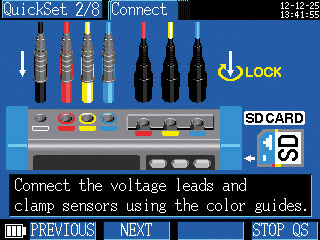La funzione di navigazione "Quick Set" permette a tutti gli utilizzatori, anche ai meno esperti, di attivare la misura seguendo passo passo le istruzioni di configurazione dello strumento, di realizzazione e controllo delle connessioni mediante cavi e boccole colorate ed l'avvio della registrazione. Inoltre, la funzione di aiuto in linea fornisce ogni informazione pratica necessaria ad escludere impostazioni e connessioni errate.