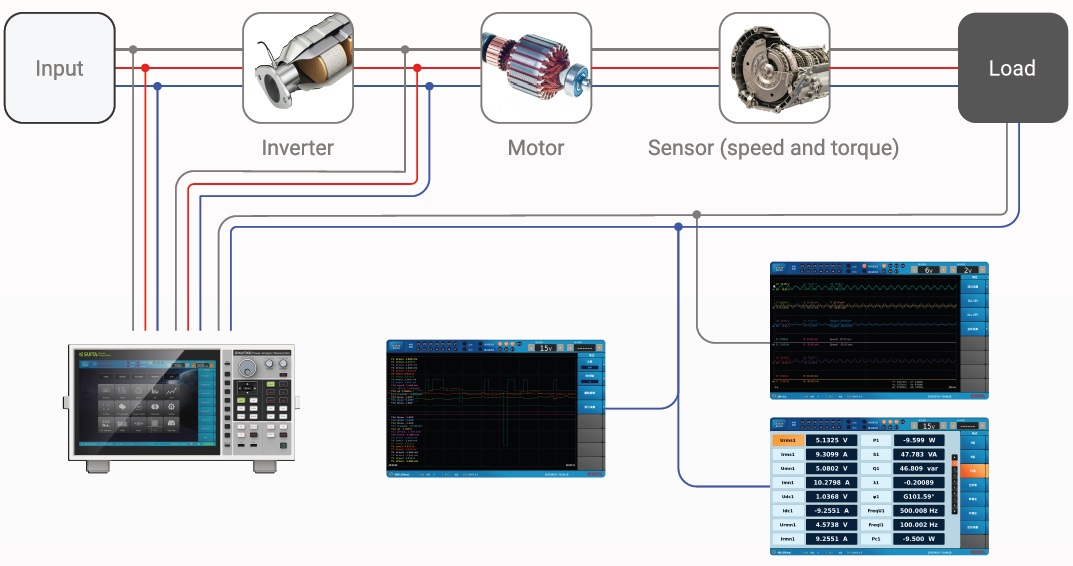 Grazie ai 7 canali di misura della potenza a il doppio canale di misura del motori, l'analizzatore di potenza SPAW7000 è in grado di misurare e valutare la tensione, la corrente, la potenza e l'efficienza dell'inverter del veicolo elettrico, del caricabatterie, della batteria, del motore e così via.