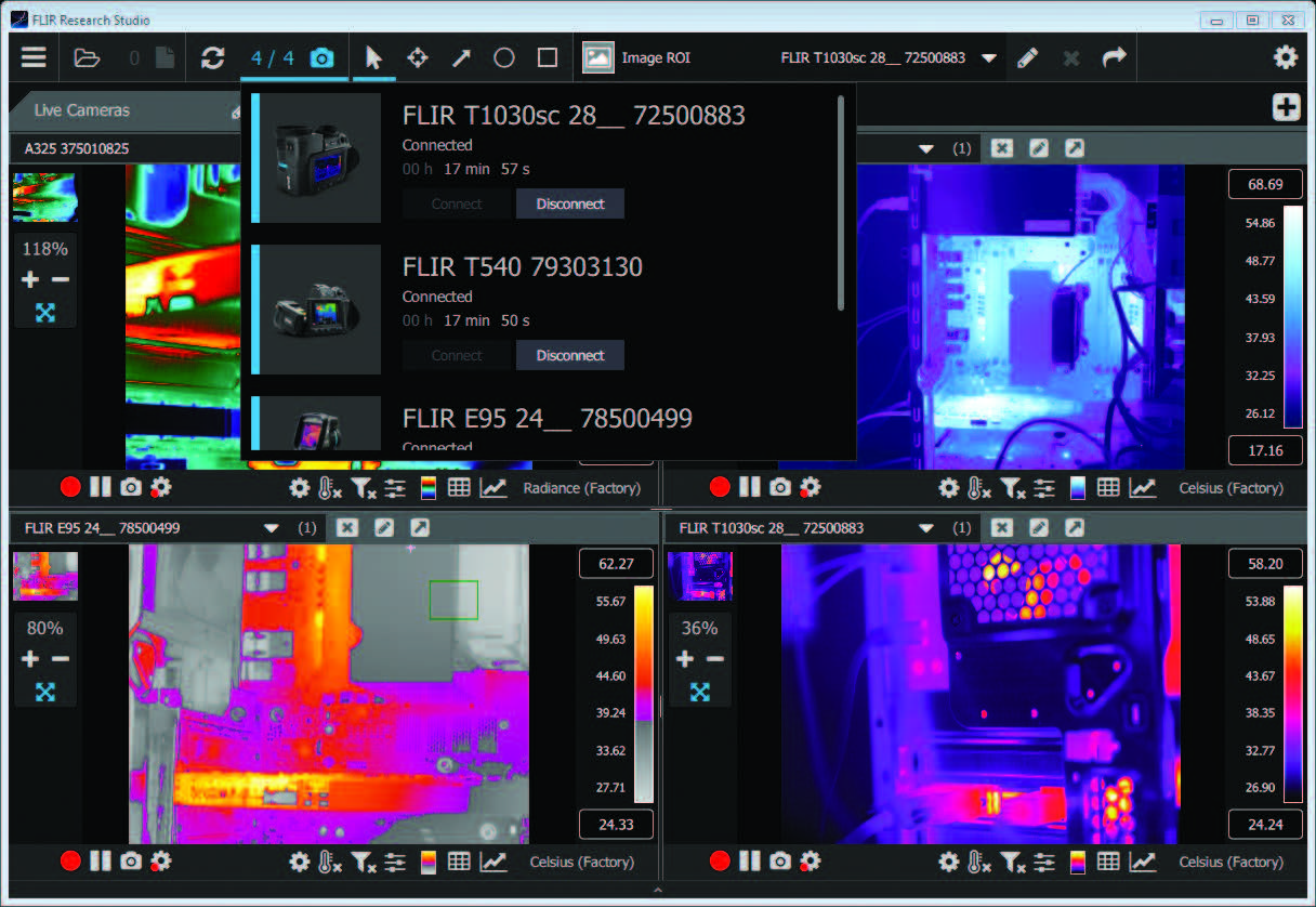 Disponibile per i sistemi operativi Windows, MacOS o Linux, Flir Research Studio consente di registrare e valutare i dati provenienti da più termocamere Flir e fonti registrate simultaneamente sulle diverse piattaforme.