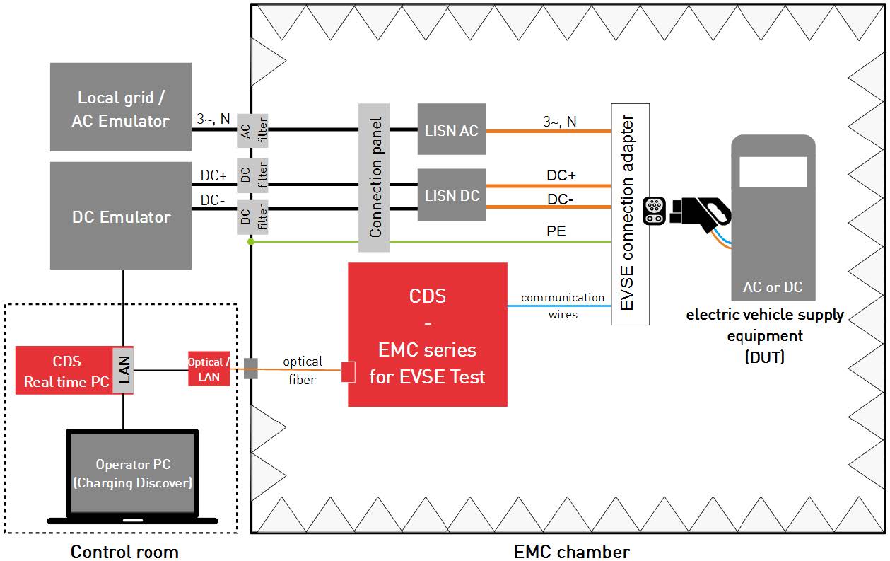 Il sistema di test CDS si frappone tra la colonnina e il veicolo emulando il comportamento dei sistemi di controllo ed effettuando simultaneamente le misure sui parametri elettrici per verificare la conformità ai vari standard previsti per la ricarica delle auto elettriche.