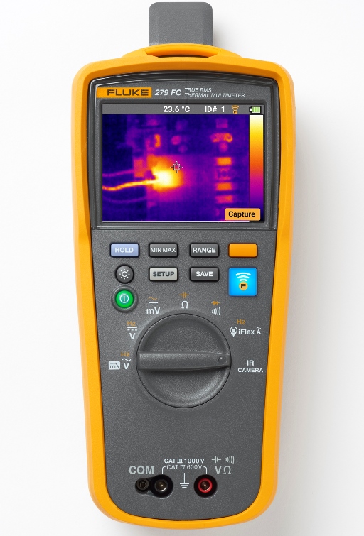 Il multimetro con termocamera 279 FC di Fluke combina in uno solo strumento di misura compatto le funzioni di un multimetro digitale a vero valore efficace (True RMS) e di una termocamera.