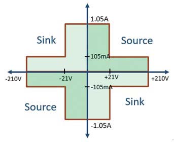 L'alimentatore programmabile integrato nello strumento GSM-20H10 funziona a quattro quadranti con intervallo di funzionamento compreso tra di ±210 V/±1,05 A e potenza massima 22 W.