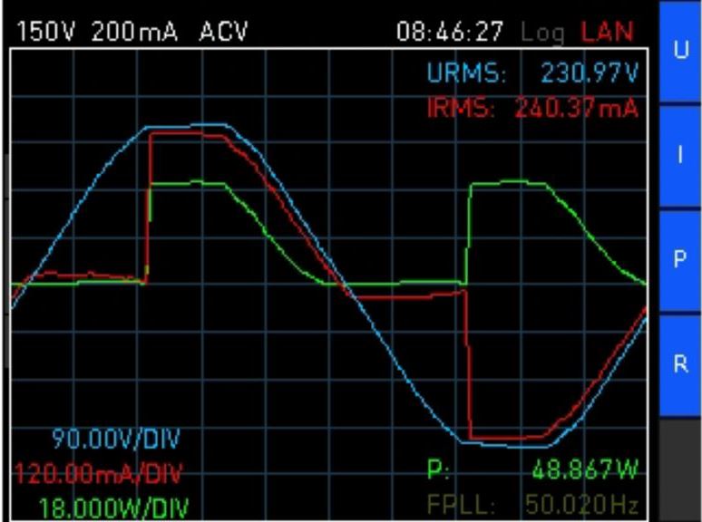 Visualizzazione simultanea di tensione, corrente e potenza in un periodoEntrambi gli strumenti dispongono anche di una modalità di visualizzazione grafica. È possibile visualizzare nel dominio del tempo la corrente di spunto all'accensione, le forme d'onda di tensione e corrente simultaneamente o una selezione di parametri su periodi più lunghi. Nel dominio della frequenza, è possibile visualizzare i risultati fino alla 50ma armonica, se necessario in forma logaritmica o come tabella.