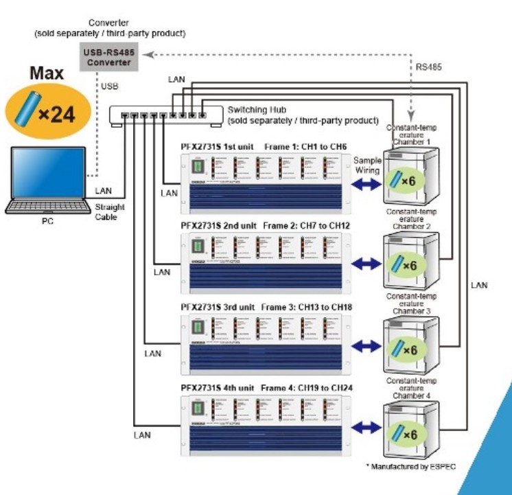 Esempio di banco di prova per batterie con 4 tester Kikusui PFX2731S e 4 camere climatiche controllate via PCApplicazioni pratiche del battery tester Kikusui PFX2731S: