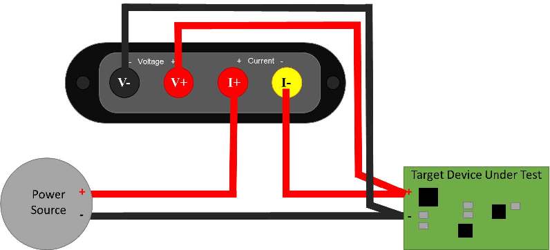Collegamento tipico dell'analizzatore Joulescope JS220 per la caratterizzazione dettagliata dei consumi energetici