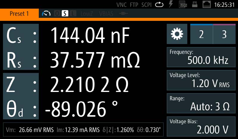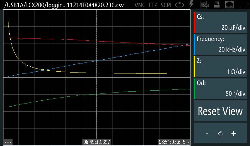 I misuratori LCR R&S LCX hanno una funzione di data logging rapido che permette di registrare tutti i valori misurati fino a 10 volte al secondo, mentre le misure di impedenza dinamica possono essere eseguite utilizzando la funzione di analisi avanzata. Tramite una scansione, i valori di impedenza possono essere determinati per una serie di valori di frequenza o di altri parametri operativi.