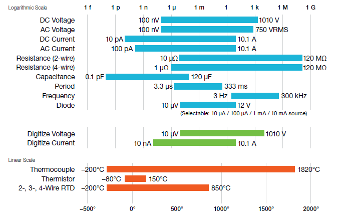 La sensibilità particolarmente elevata di questo multimetro digitale permette ai progettisti di eseguire misure su prodotti a basso consumo. Con il multimetro Keithley DMM6500 è possibile misurare correnti in continua (DC) di 10 pA e resistenze di valore pari a 1 µΩ. L'accuratezza è particolarmente spinta, pari allo 0,0025% per un anno, e le specifiche sono garantite per due anni in modo da consentire intervalli di calibrazione più lunghi, con riflessi favorevoli su costo di possesso.
