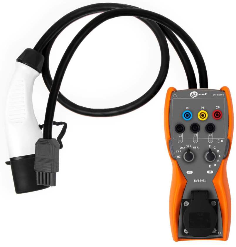 L'adattatore EVSE-01 è dedicato al test delle stazioni di ricarica AC dotate di un connettore di tipo II e si collega alla famiglia di misuratori multifunzione MPI di Sonel.