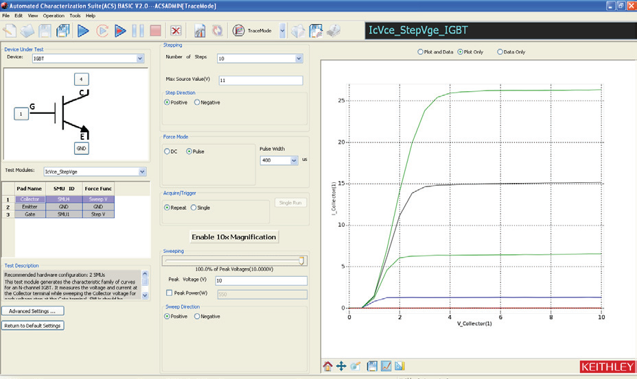 La sincronizzazione veloce ottimizza le prestazioni delle modalità impulsive ad alta velocità dei nuovi SourceMeter ad alta potenza modelli 2651A e 2657A, mentre il pacchetto software ACS Basic Edition offre tool di analisi e di controllo particolarmente indicati per la caratterizzazione di dispositivi ad alta potenza, comprese esaustive librerie di collaudo parametrico per MOSFET, BJT, triac, diodi, IGBT e altri tipi di dispositivi.