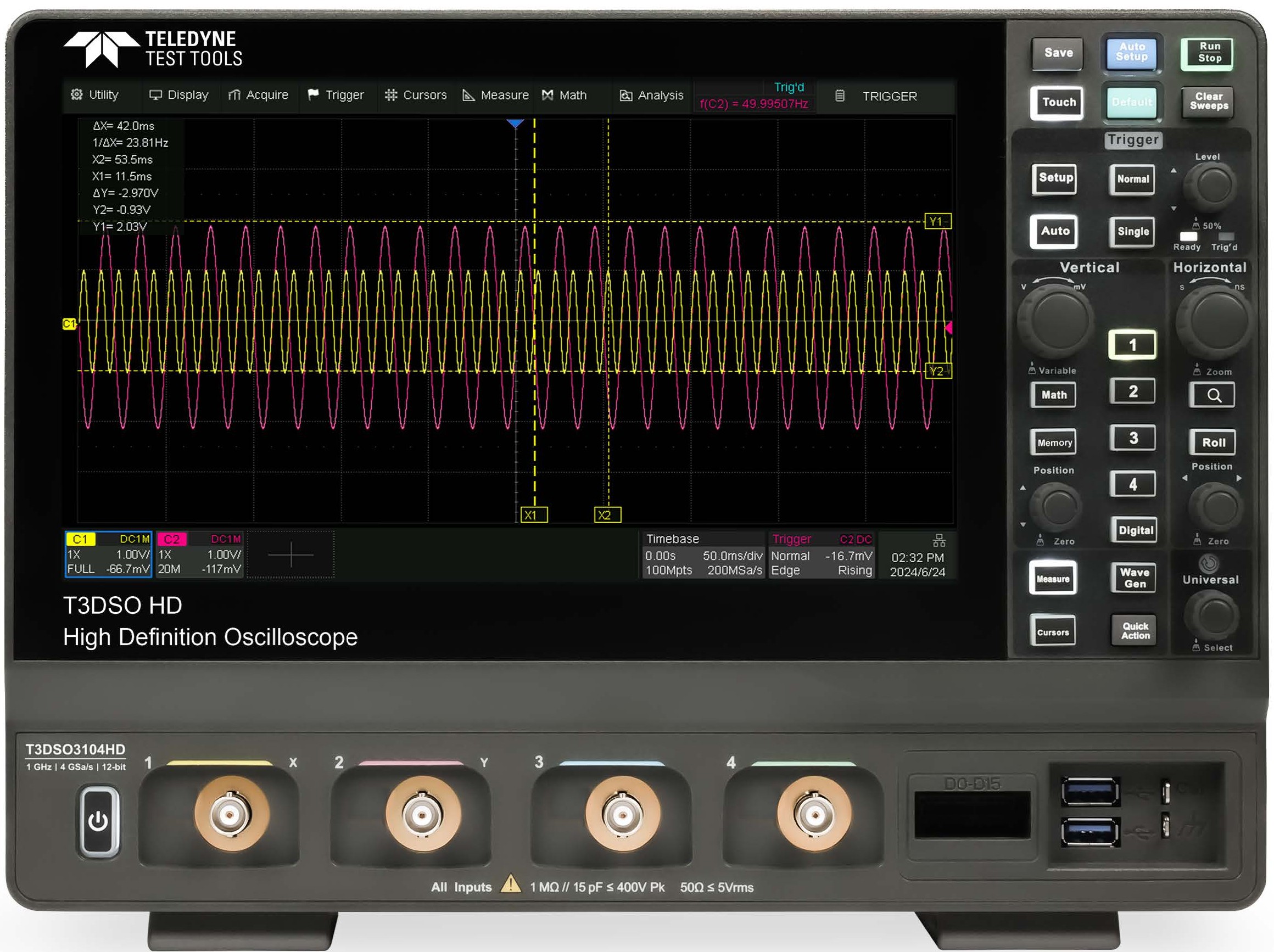 Gli oscilloscopi Teledyne Test Tools T3DSO3000HD sono strumenti da banco a 4 canali e stadio di conversione analogico/digitale nativo a 12 bit disponibili con larghezza di banda analogica di 200 MHz, 350 MHz, 500 MHz e 1 GHz.