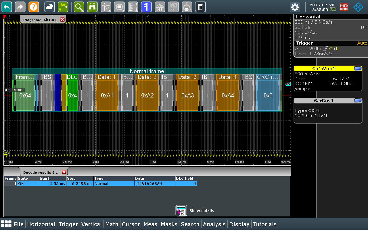 Per facilitare lo sviluppo e il debug di sistemi elettronici che comunicato tramite il bus CXPI, Rohde & Schwarz ha sviluppato un pacchetto software per i suoi oscilloscopi delle famiglie RTE e RTO dedicato al trigger e la decodifica dei segnali del protocollo CXPI.
