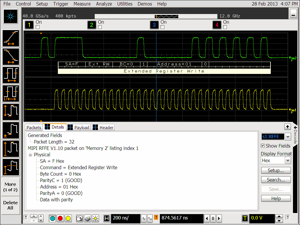 Il decodificatore di protocollo facilita le attività di sviluppo e validazione di progetti che sfruttano il protocollo RFFE per controllare i circuiti a radiofrequenza, quali amplificatori di potenza, moduli di gestione della potenza, sintonizzatori di antenna e sensori che vengono utilizzati nelle moderne applicazioni wireless.