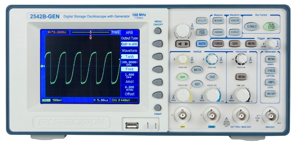 Gli oscilloscopi B&K Precision 2540B-GEN e 2542B-GEN, rispettivamente con larghezza di banda di 60 MHz e 100 GHz, hanno una frequenza di campionamento massima di 1 Gs/s e memoria di acquisizione fino a 2,4 Ms. Grazie al generatore integrato possono ora svolgere la funzione di due strumenti in uno solo.