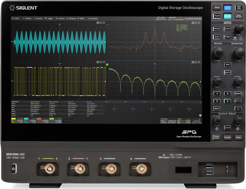 Il nuovo oscilloscopio Siglent SDS7000A offre 4 canali analogici e 16 canali digitali, con larghezze di banda di 3 GHz o 4 GHz e una frequenza di campionamento massima di 20 GSa/s con risoluzione verticale hardware nativa di 12 bit e una profondità della memoria di acquisizione standard di 500 Mpts per canale, che può essere espansa a 1 Gpts/ch.