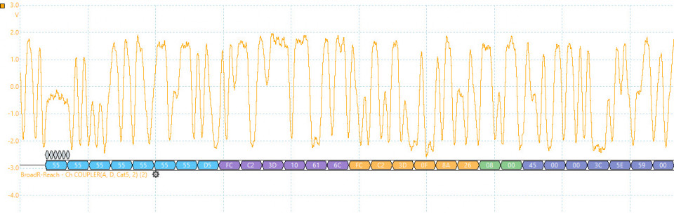 Una volta separate nelle due direzioni di traffico, le forme d'onda vengono decodificate tramite il pacchetto PicoScope BroadR-Reach per visualizzare il contenuto di ciascun pacchetto dati allineato alla sua corrispondente forma d'onda nel dominio del tempo.