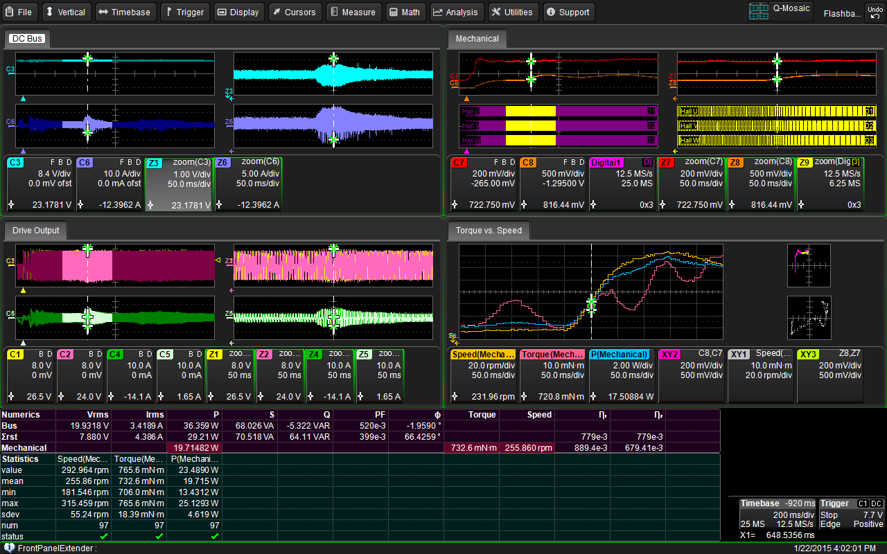 La grande memoria di acquisizione dei Motor Drive Analyzer (fino a 250 Mpts//canale) facilita l'analisi del comportamento dinamico o di risposta ai transitori anche dei più complessi sistemi di azionamento trifase.