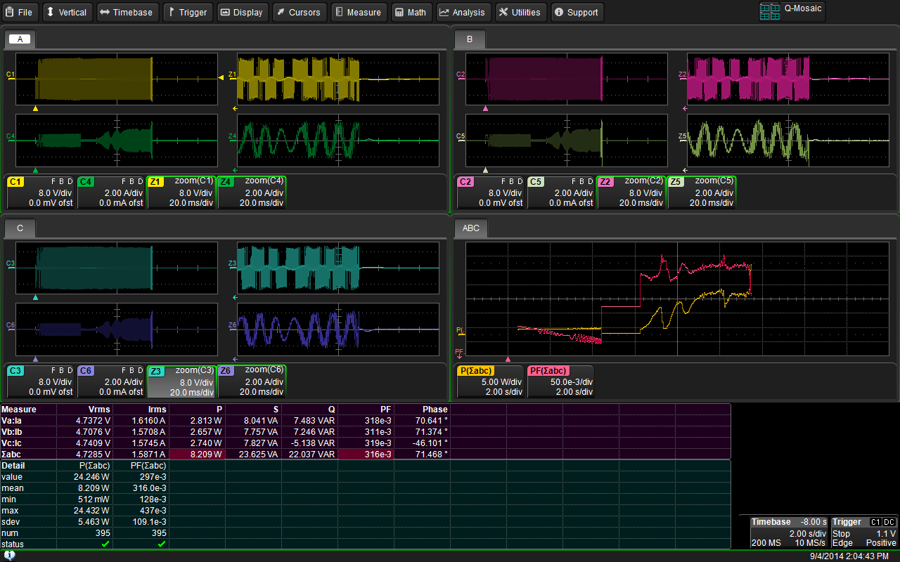 Le rappresentazioni sull'ampio display dell'oscilloscopio HDO8000 possono comprendere numerosi parametri operativi, come tensione, corrente, potenza (reale, apparente, reattiva), angolo di fase, fattore di potenza e rendimento, che vengono calcolati in tempo reale a partire della forme d'onda acquisite fornendo le informazioni solitamente fornite da un classico wattmetro analizzatore di potenza.
