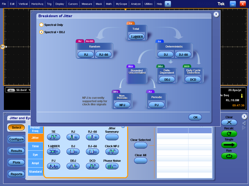 Ciò consenete agli oscilloscopi in tempo reale di misurare il jitter totale e separare quello dovuto alla diafonia o all'interferenza intersimbolica (ISI) dalle altre sorgenti di jitter che affliggono il sistema.