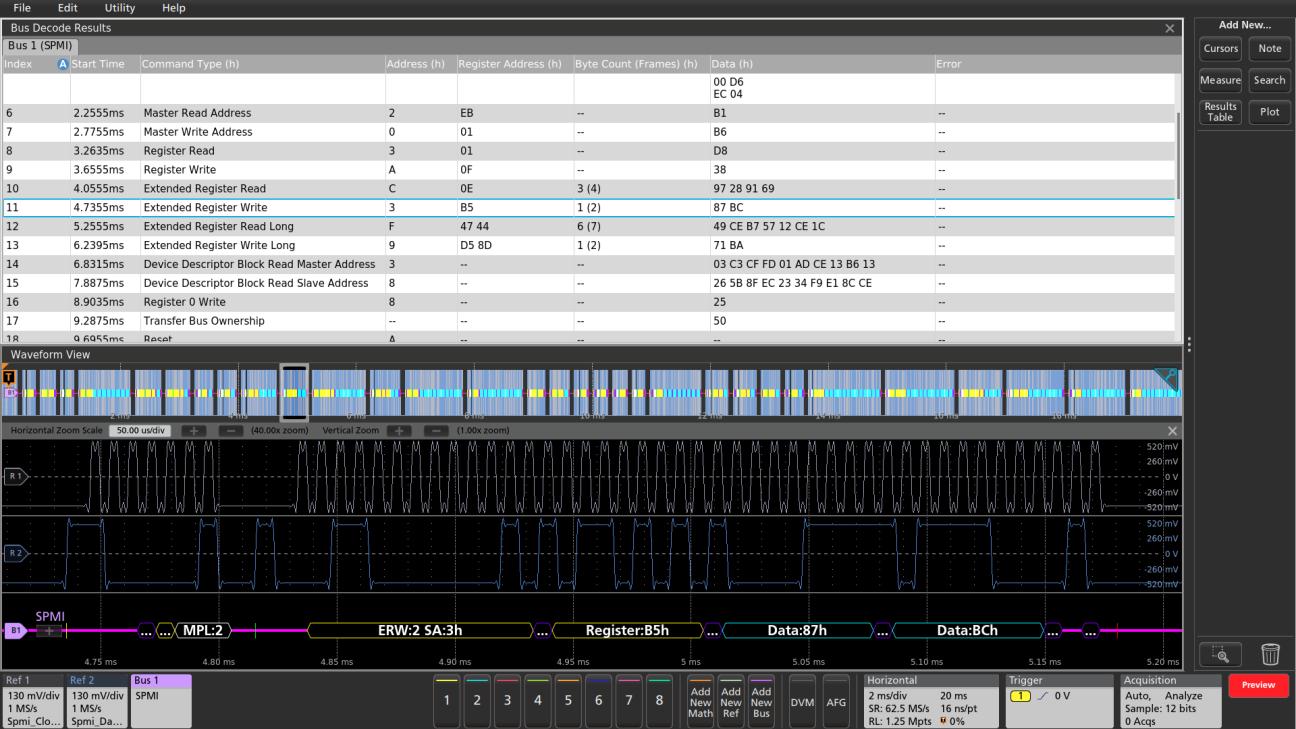Grazie all'opzione di decodifica SPMI di Tektronix, è possibile visualizzare in modo semplice e chiaro l'attività del bus, riducendo i tempi e con risultati più rapidamente interpretabili rispetto alla tediosa attività di decodifica manuale del bus.
