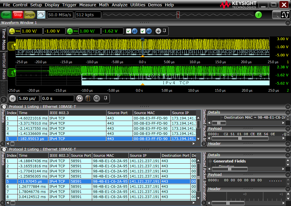 I decodificatori di protocolli Ethernet Keysight N8825A (per gli oscilloscopi delle famiglie 90000A, 90000 X-, 90000 Serie Q, Z e V) e N8825B (per gli oscilloscopi Serie S) facilitano notevolmente la rilevazione di eventuali problemi sulle interfacce 10BASE-T/100BASE-TX riportando in chiaro le informazioni sui pacchetti dati e facilitando la ricerca di eventi o condizioni specifiche.