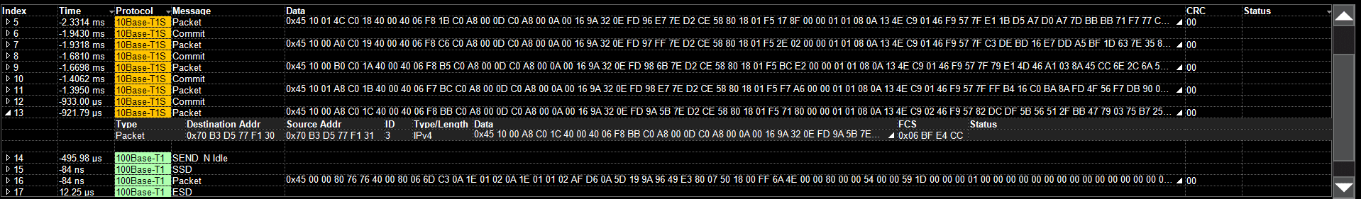 - T (Trigger): Mappatura automatica dell'ID del nodo a un indirizzo MAC in base all'analisi del ciclo PLCA. È possibile attivare il trigger su Beacon, ID, ID + DATA, Commit/Sync, ESD ed errore CRC. Impostazione di trigger condizionati sui dati con condizioni complesse. È particolarmente utile in situazioni in cui si devono monitorare eventi anomali, ad esempio quando un utente segnala una velocità del motore troppo bassa o troppo alta, o una temperatura del liquido di raffreddamento troppo alta.
