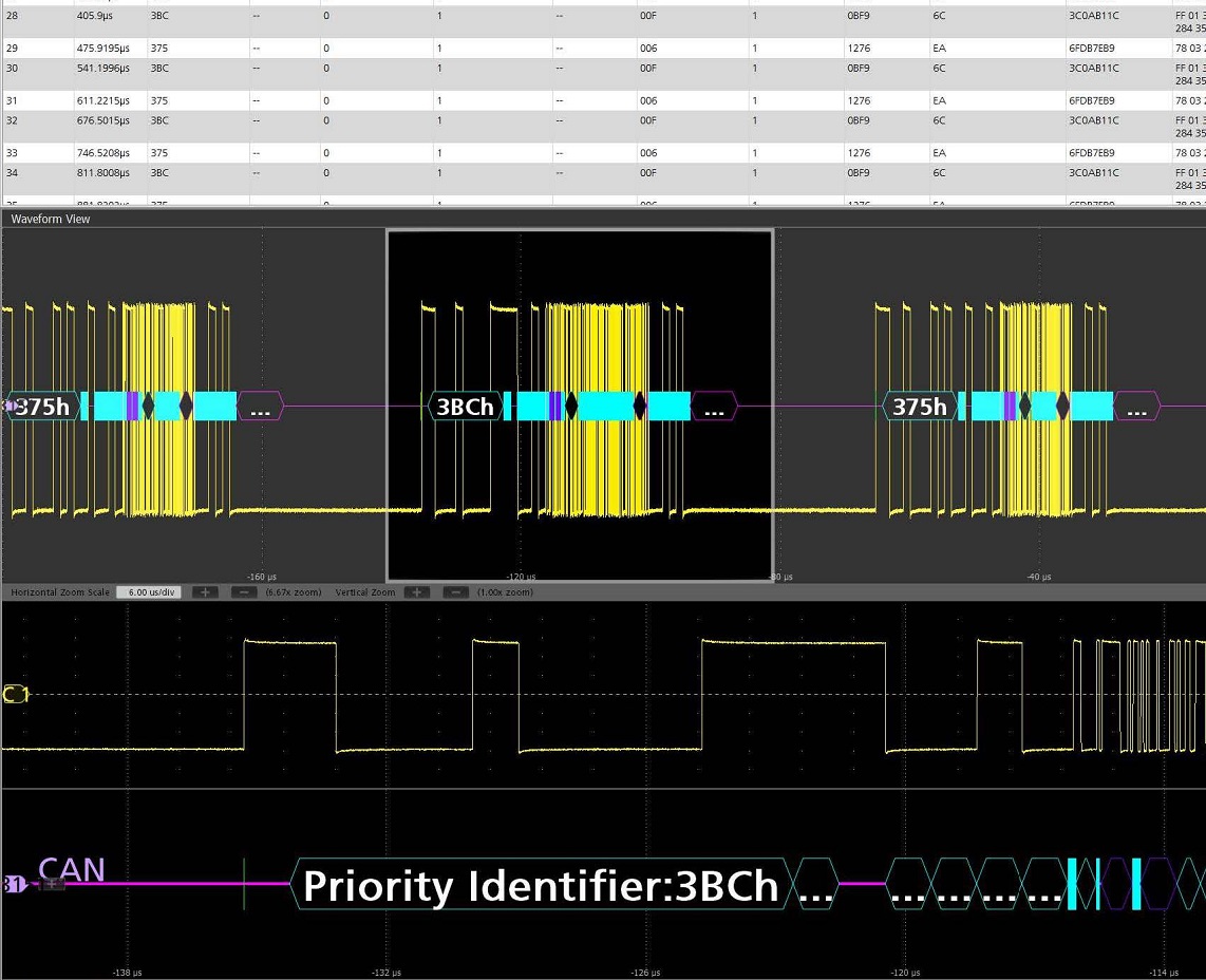 Decodifica bus CAN XL con rappresentazione dati sulla forma d'onda e tabella dei simboli con marche temporaliCon questa release, Tektronix velocizza le attività di progettazione e debug legate alle comunicazioni sul bus CAN XL, mentre l'interfaccia utente intuitiva degli oscilloscopi MSO Serie 4, 5 e 6 contribuisce ad accelerare i flussi di lavoro dei sempre più numerosi clienti del settore dei trasporti che hanno scelto il bus CAN XL.