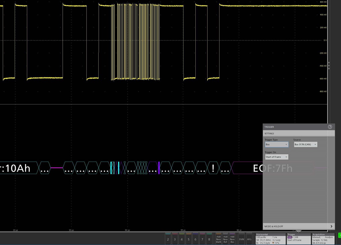 Impostazione del trigger sul bus CAN XL in corrispondenza dell'evento Start of FrameIl pacchetto software include la capacità di impostare il trigger in corrispondenza dei segnali CAN XL Start of Frame e End of Frame, nonché di cercare tra i segnali acquisiti per individuare degli specifici pacchetti CAN XL. Il software gestisce anche la decodifica dei pacchetti CAN e CAN FD, supportando le reti in modalità mista.