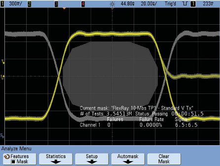 Oltre alle funzionalità di trigger sui frame del bus FlexRay e la decodifica hardware del protocollo, la nuova opzione software per gli oscilloscopi Agilent dà la possibilità di eseguire misure con diagrammi a occhio di vario tipo e di eseguire tutte le prove di conformità sul livello fisico del bus FlexRay.