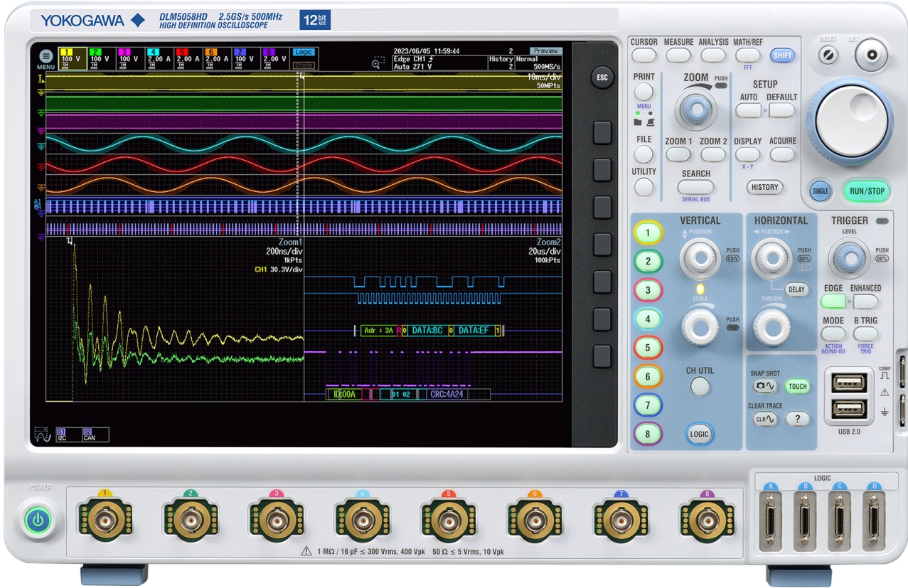 Oscilloscopio Yokogawa DLM5000HD con risoluzione verticale a 12 bit per vedere con maggior dettaglio i segnaliLa serie di oscilloscopi DLM5000HD è composta da due modelli a 8 canali (DLM5058HD a 500 MHz e DLM5058HD a 350 MHz) e due modelli a 4 canali (DLM5054HD a 500 MHz e DLM5034HD a 350 MHz).