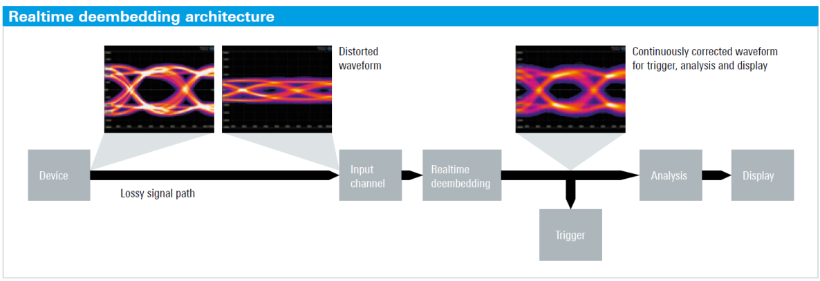 Una tecnologia particolarmente innovativa presente in questa nuova famiglia di strumenti e la funzione di deembedding in tempo reale realizzata tramite hardware dedicato. Il vantaggio che si ottiene è che l'oscilloscopio rimane estremamente veloce e reattivo anche quando si attiva la modalità deembedding per compensare le inevitabili distorsioni che si generano nei segnali ad altissima velocità nel collegamento tra punto di misura e oscilloscopio.