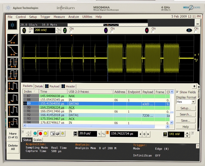 Gli oscilloscopi Agilent serie 9000 possono anche integrare 16 canali digitali per l'analisi logica e un analizzatore di protocollo per visualizzare i segnali automaticamente con le informazioni logiche di protocollo su bus seriali veloci come PCIe e USB 3.0.